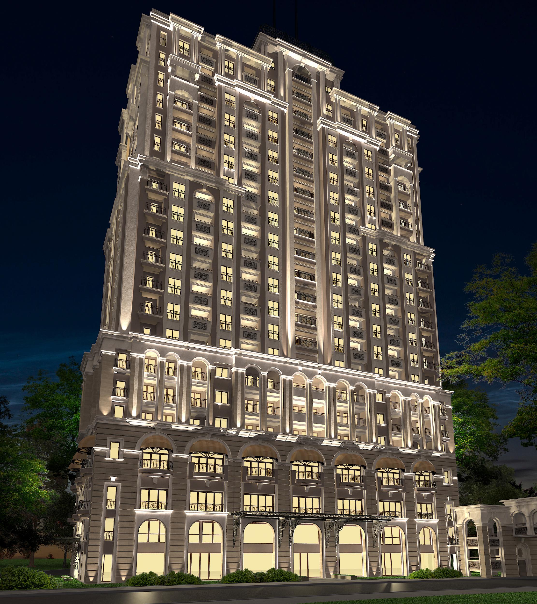 Offers 179 apartments - studios and apartments with one, two and three bedroom apartments, ranging from 46 to 324 sq.m. All apartments are finished "turnkey": Flooring - parquet, ceramic granite tile and carpet-to-order; painting ceilings, painting and wallpaper on the walls, fixtures and sanitary ware in the bathrooms and toilets. Common areas with marble and carpet on the floor, on the walls will use a combination of painting and wallpaper in pastel colors, built in lighting on the ceiling, painting, emphasizing the style of the building and the windows as the finishing detail.